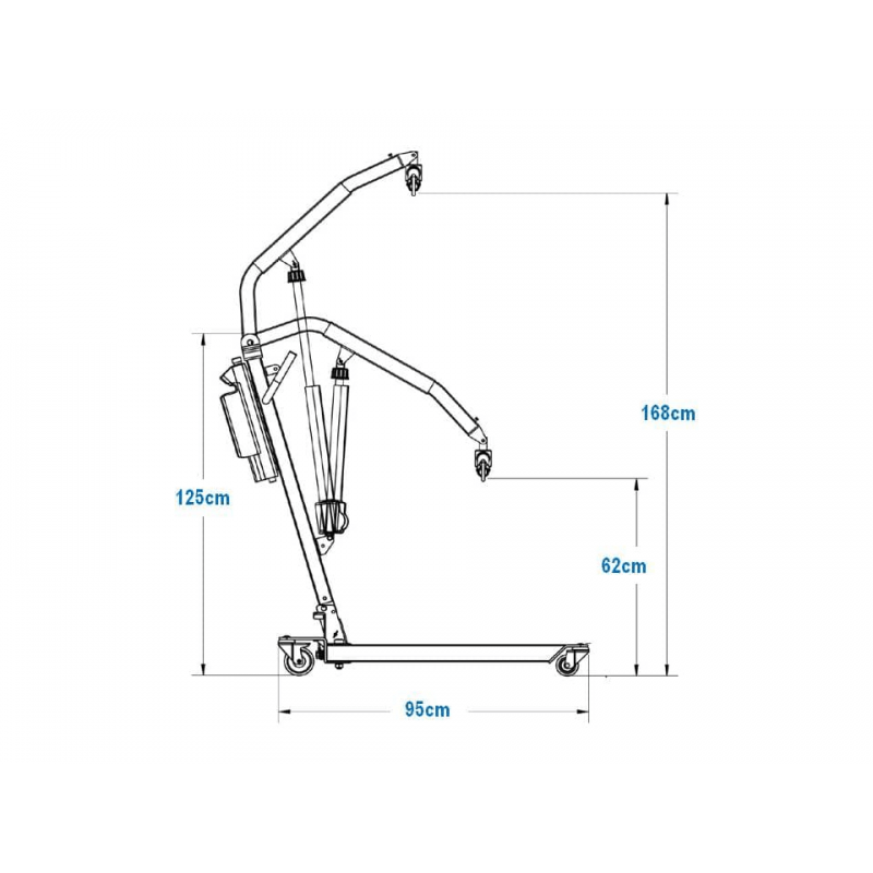 La grúa Vulcan Mini está fabricada en acero de alta calidad y soporta un peso máximo de usuario de hasta 150 kg. Cuenta con un motor eléctrico de 8000 N con velocidad de 7 mm/s y un mando a distancia con indicador de carga digital. La percha tiene un rango de elevación desde 62 cm hasta 168 cm y gira 360º para adaptarse al movimiento del usuario. La grúa también tiene un sistema de apertura de patas a pedal que le da mayor estabilidad y espacio al usuario. Las ruedas traseras tienen freno para bloquear la grúa cuando sea necesario.