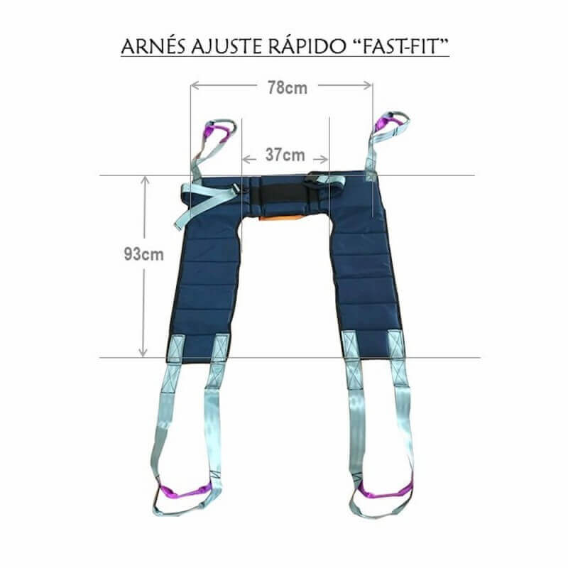 La grúa Vulcan Mini tiene como accesorio opcional un arnés acolchado de alta calidad que se ajusta al cuerpo del usuario y lo sujeta con firmeza durante el traslado. El arnés se engancha a la percha mediante unos mosquetones con sistema anti-retorno. Para higienizarlo se puede lavar a máquina a 30ºC.